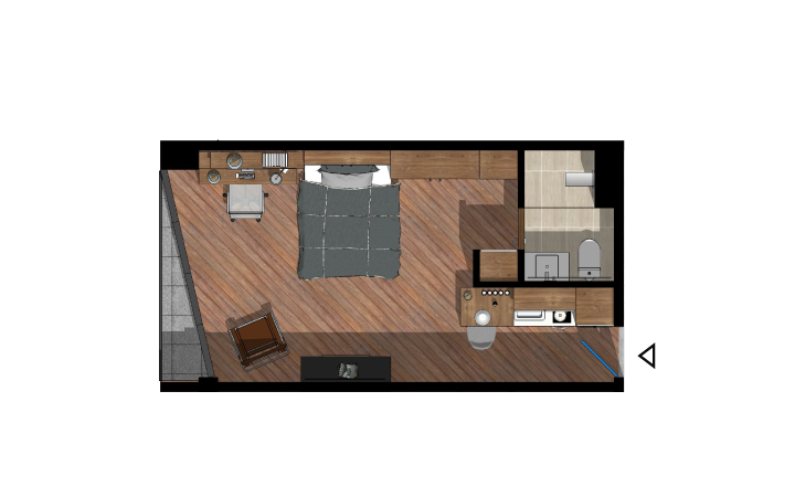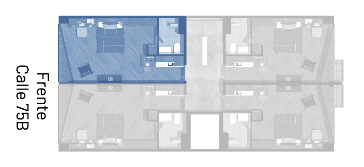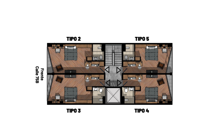 Los pisos 2 a 5 cuentan con 4 cómodos studios por piso, cada uno con terraza, baño, zona cocina y lavado. Un solo ambiente. Pasillo espacioso entre cada apartamento y ascensor.
